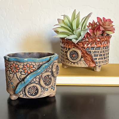 Craft decorative containers excellent for succelents. Learn to use soft slabs, apply deep textures, attach feet and plan for finishing and glazing on your own.